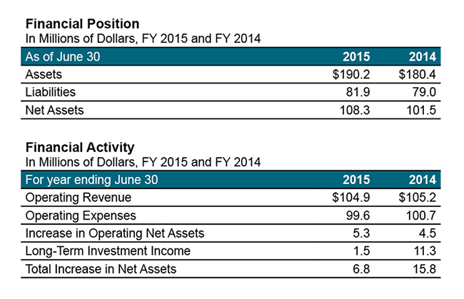 The College had another year of strong performance for the fiscal year ending June 30, 2015. The net from operations was $5.3 million for the year, a 17% increase over the prior year.
