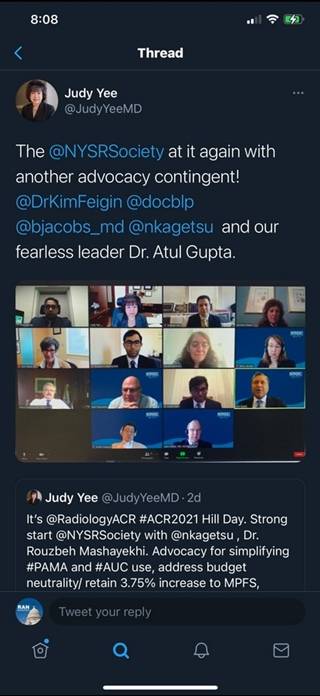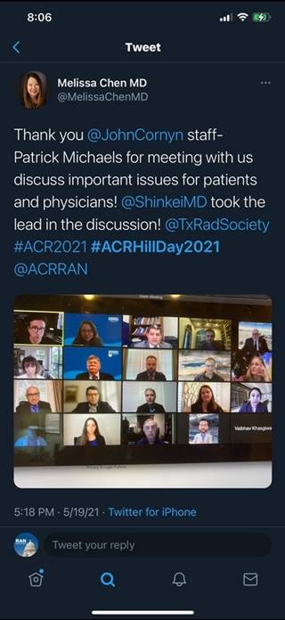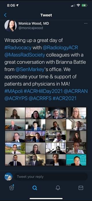 The Radiology Advocacy Network is pleased to announce the winners of this year’s Hill Day Twitter picture contest that took place during ACR 2021. Despite Hill Day being held virtually this year due to COVID-19, #Radvocates were challenged to participate by sharing images of their virtual meetings when possible. The three winners are Monica Wood, MD; Melissa Chen, MD; and Judy Yee, MD. They were chosen for highlighting the importance of advocacy and engagement from their respective chapters. The winners will receive a gift card of their choice.