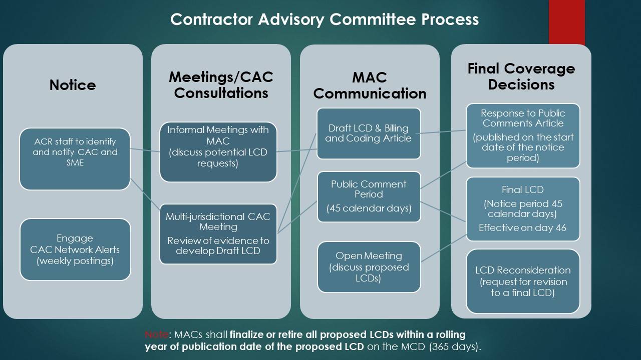 When a Medicare contractor develops a new LCD or significantly revises an existing one, a 45-day public comment period is required. During this time, Contractor Medical Directors (CMDs) solicit input from members of the CAC. Comments can be submitted to the CMD or electronically through your Medicare contractor's website. After the CMDs have considered all comments received, there is a 45-day notice period prior to implementation of the final LCD. Providers and billing staff should track LCD changes using the Medicare Coverage Database. The Centers for Medicare and Medicaid Services (CMS) has revised rules for the development and administration of Medicare Local coverage determinations (LCDs). Learn more about the LCD Modernization Process effective January 1, 2019.