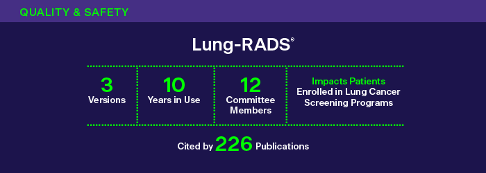 Lung-RADS® is a quality assurance tool designed to standardize lung cancer screening CT reporting and management recommendations, reduce confusion in lung cancer screening CT interpretations, and facilitate outcome monitoring.