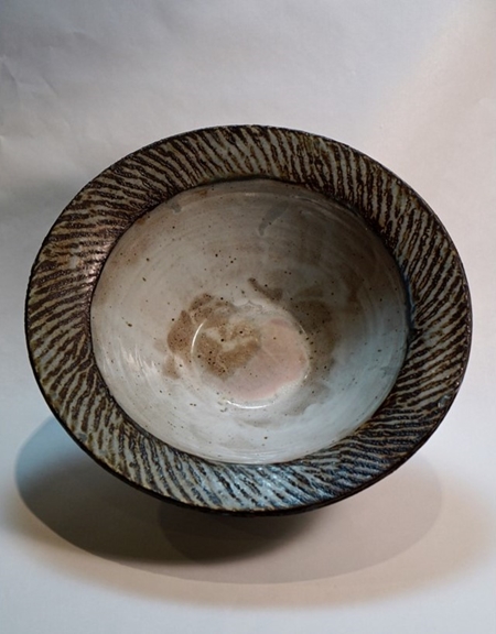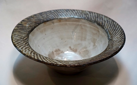 ![]() Stoneware bowl; slip inlay decoration of rim using rope; white glaze inside. |