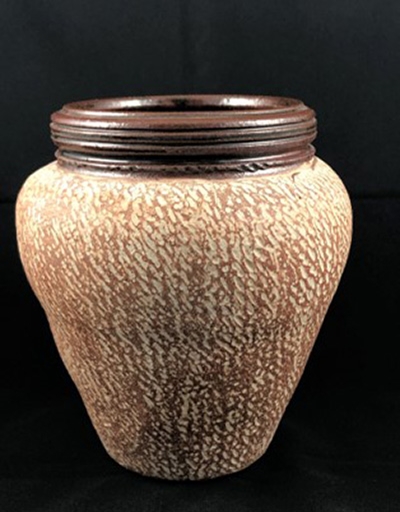 Shimaoka uses a decorative technique that he called rope-impressed inlay. His process is based on impressing pre-fired, soft clay vessels with rope to create patterns in the clay. The clay is then coated with a colored liquid clay called slip. When the slip is dry, it is scraped from the high points of the impressed design.