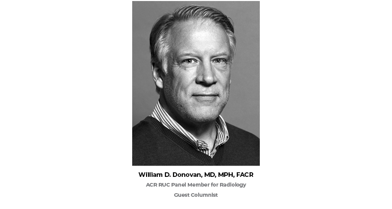 Currently, our preeminent reimbursement challenge stems from the recent up-valuation of the evaluation and management codes performed chiefly by primary care providers. Their increases mean corresponding decreases in all the other specialties’ payments, by budget-neutral adjustments to the Conversion Factor. The ACR’s legislative affairs group saved the day at the end of 2020 and continues an ongoing fight to mitigate those cuts.4 The CPT and the RUC are also evaluating reimbursement strategies for AI products and arguing for appropriate valuation of work in evolving value-based payment models.5 Stay tuned for future discussions of these issues in this column and at the ACR annual meetings.