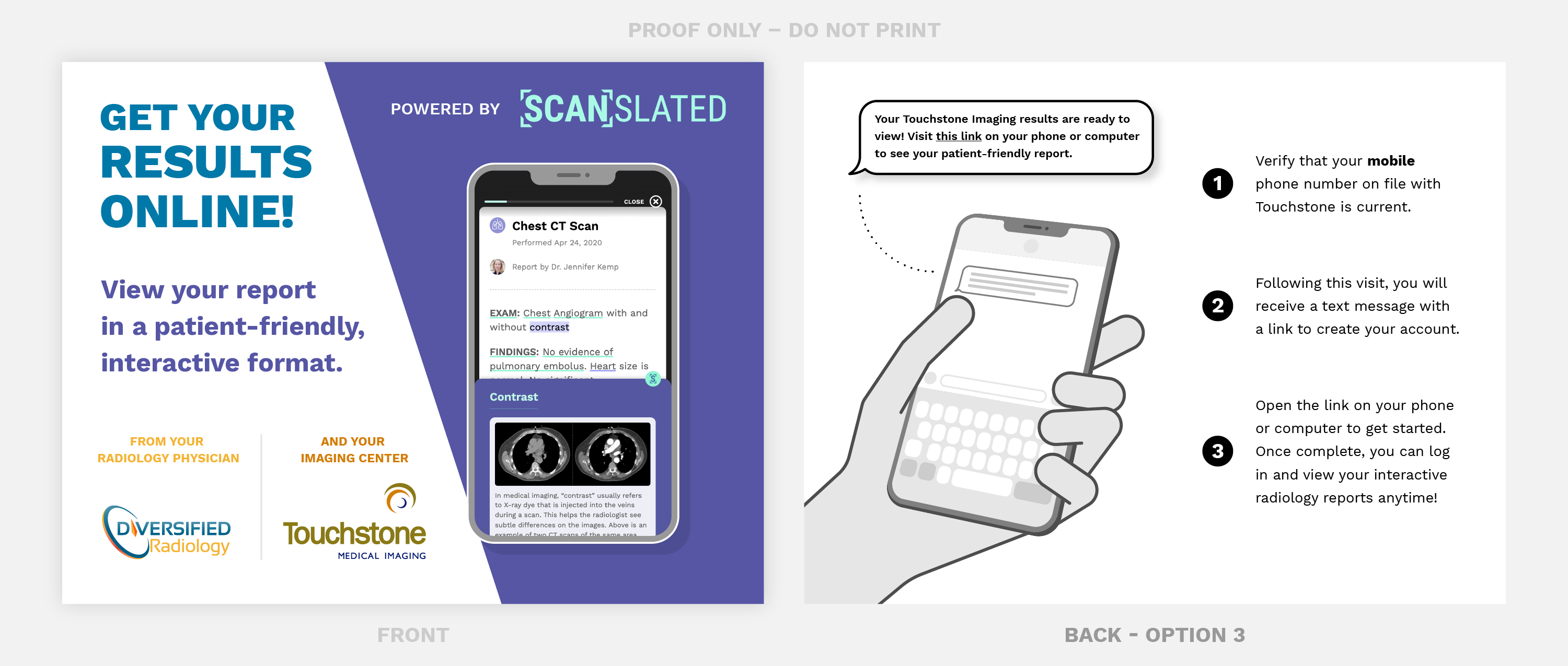 flyers explained how the tool works: After a patient receives a scan at Touchstone, the radiology images are sent to Diversified. Once the radiologist reads the images and completes the report, they send their report to Scanslated and the tool automatically annotates it. After that, the system sends an automated text message to the patient with an invite to access the report via the patient portal.