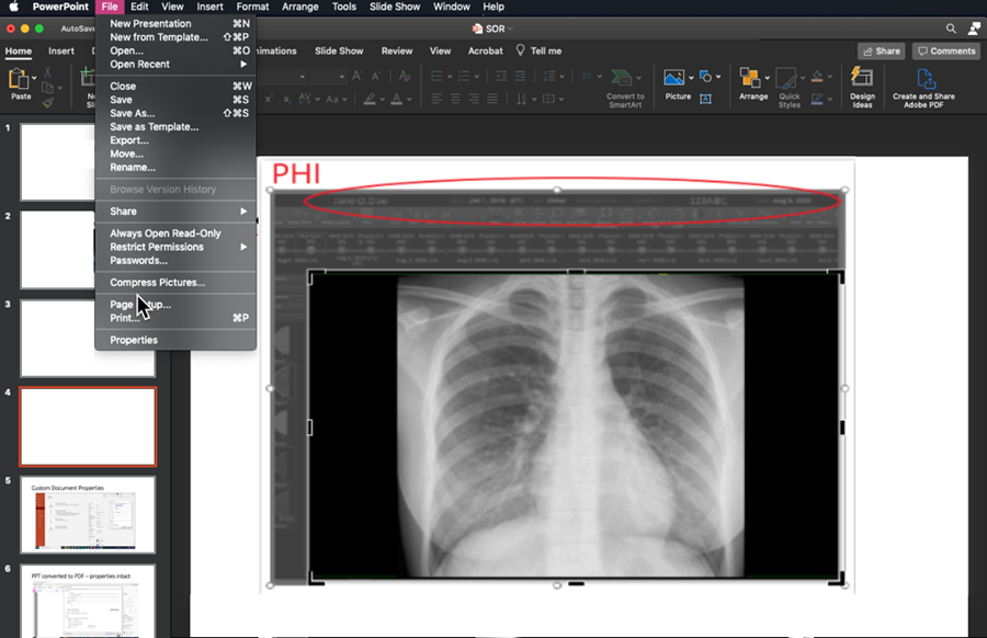 The next place to look for possible PHI exposure is during creation of a document or presentation that utilizes (exported) medical images. PowerPoint™, for example, is a Microsoft product which is frequently used to present images e.g. for medical professional education in a variety of settings.