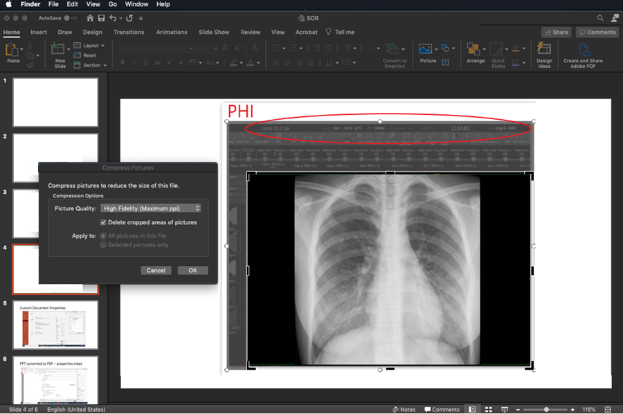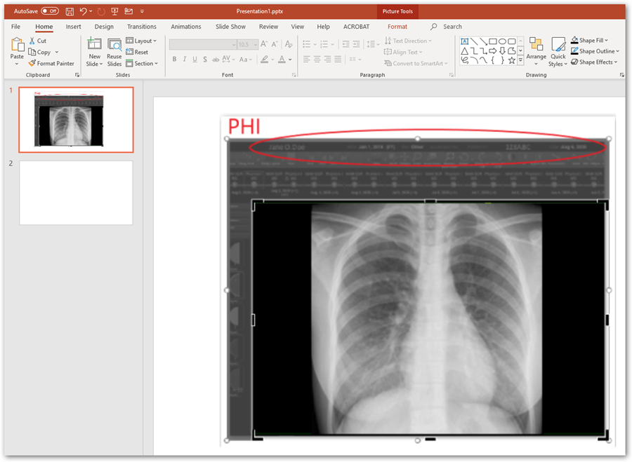 When medical images are inserted into PowerPoint™ and the user attempts to redact burned in PHI data within the pixel data, they must be careful not to simply “cover up” the PHI by use of a mask. The most commonly used tool is cropping the image with the corresponding PowerPoint™ tool, or changing font color so the text blends into the background. Neither will result in actual removal of the information, rather it is just not visible in the authoring nor the presentation state. The “cropping” can be undone later by another user of the file. Modern search engine technology can automatically identify the content of the original inserted file and index PHI that might have been included. It is important when cropping an image to explicitly delete the portion that has been cropped so that it cannot later be uncropped. Microsoft has provided instructions on how to delete the cropped areas of a picture and save the file without them.