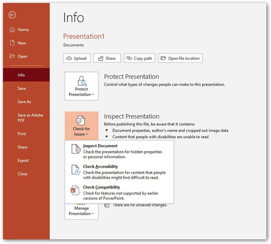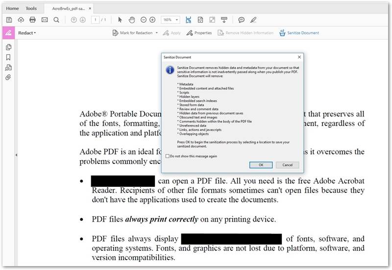Finally, presentations and documents are often converted to PDFs for sharing across the internet. Although you may not see hidden data when simply viewing a PDF through a common viewer, the PDF can contain PHI in hidden objects as well as metadata stored in tags. Adobe has a “Sanitize” function that will help you identify and redact hidden data.